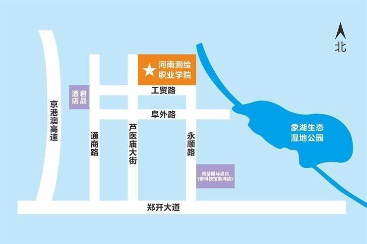自驾路线:京港澳高速郑东新区站下---开封方向---沿郑开大道前行约2公里---左转进入芦医庙大街前行1公里---河南测绘职业学院(象湖校区)。